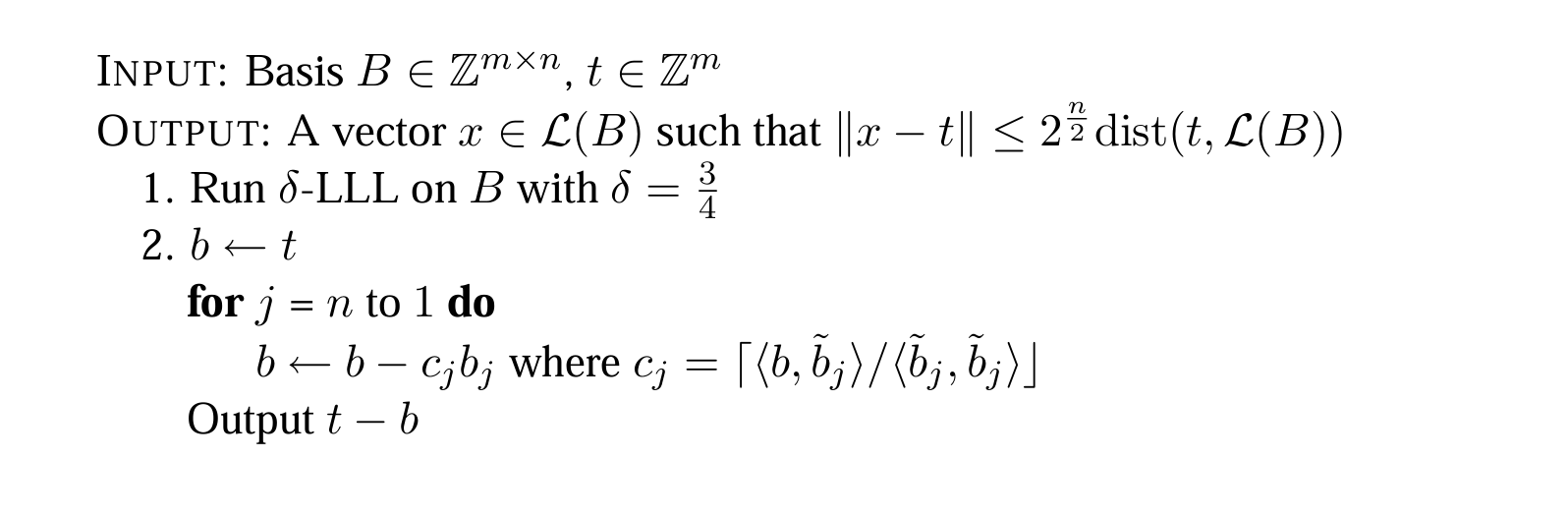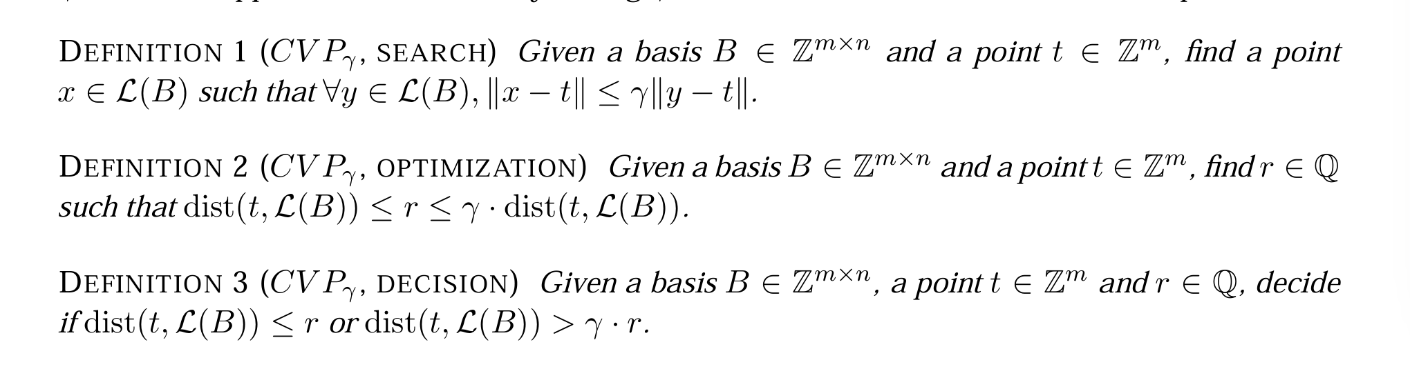 (CVP_γ,搜索):在\mathcal{L}(B)里找一个点x,让x到t的距离,不超过格里其他点到t的距离的γ倍\\
